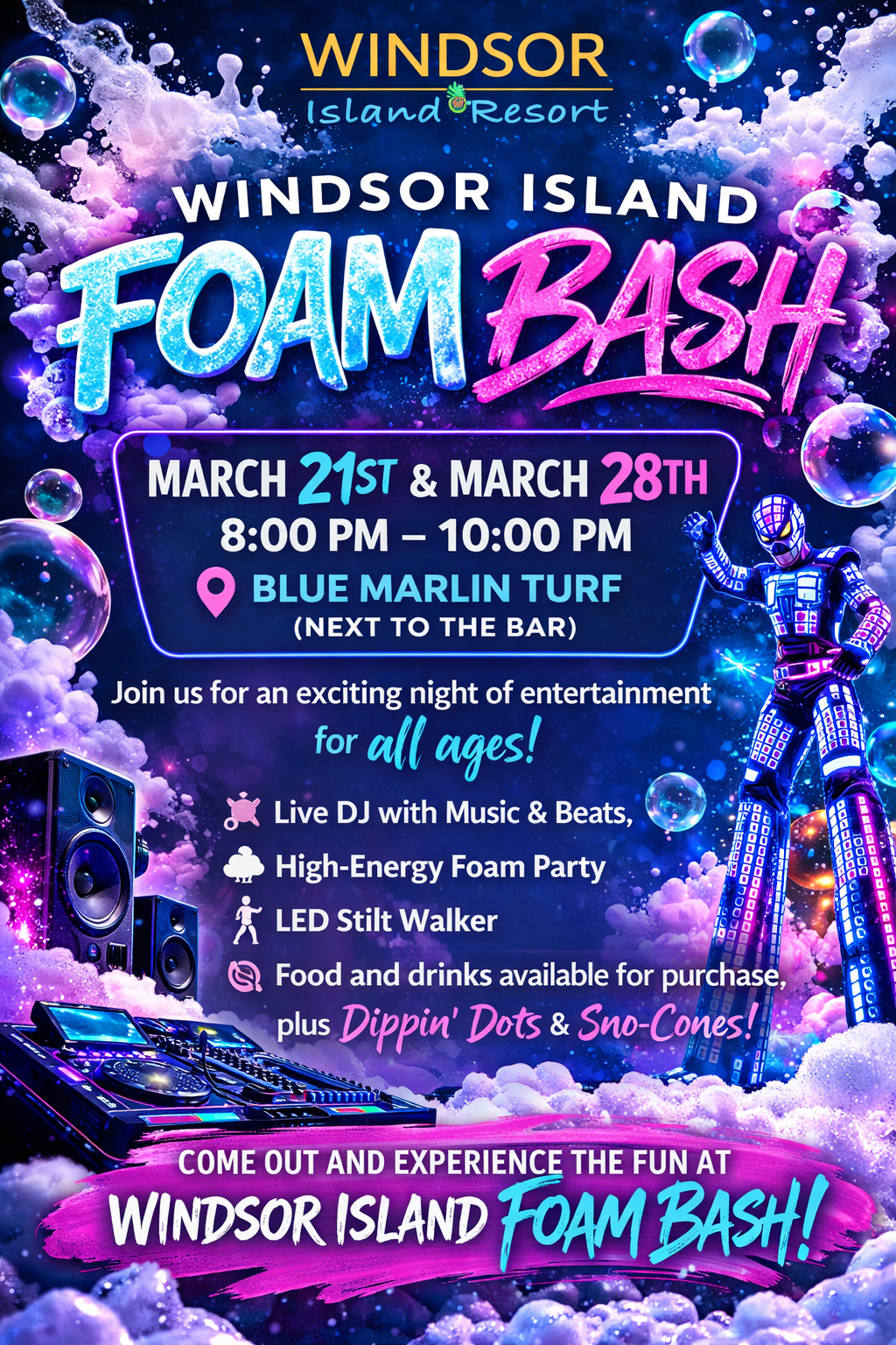 Windsor Island Resort 1115 Aloha Blvd, DavenportWindsor Island Foam Bash 🫧🎧 Get ready for an electrifying night of music, foam, and glowing fun at the Windsor Island Foam Bash! Join us on March 21st and March 28th from 8:00 PM – 10:00 PM at the Blue Marlin Turf (next to the bar) for a high-energy party perfect for all ages. Dance […]